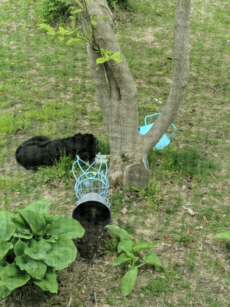 Dog Mom Fail… When I plant flowers and apparently put the chair pot holders in the dog’s favorite spot to lay down….